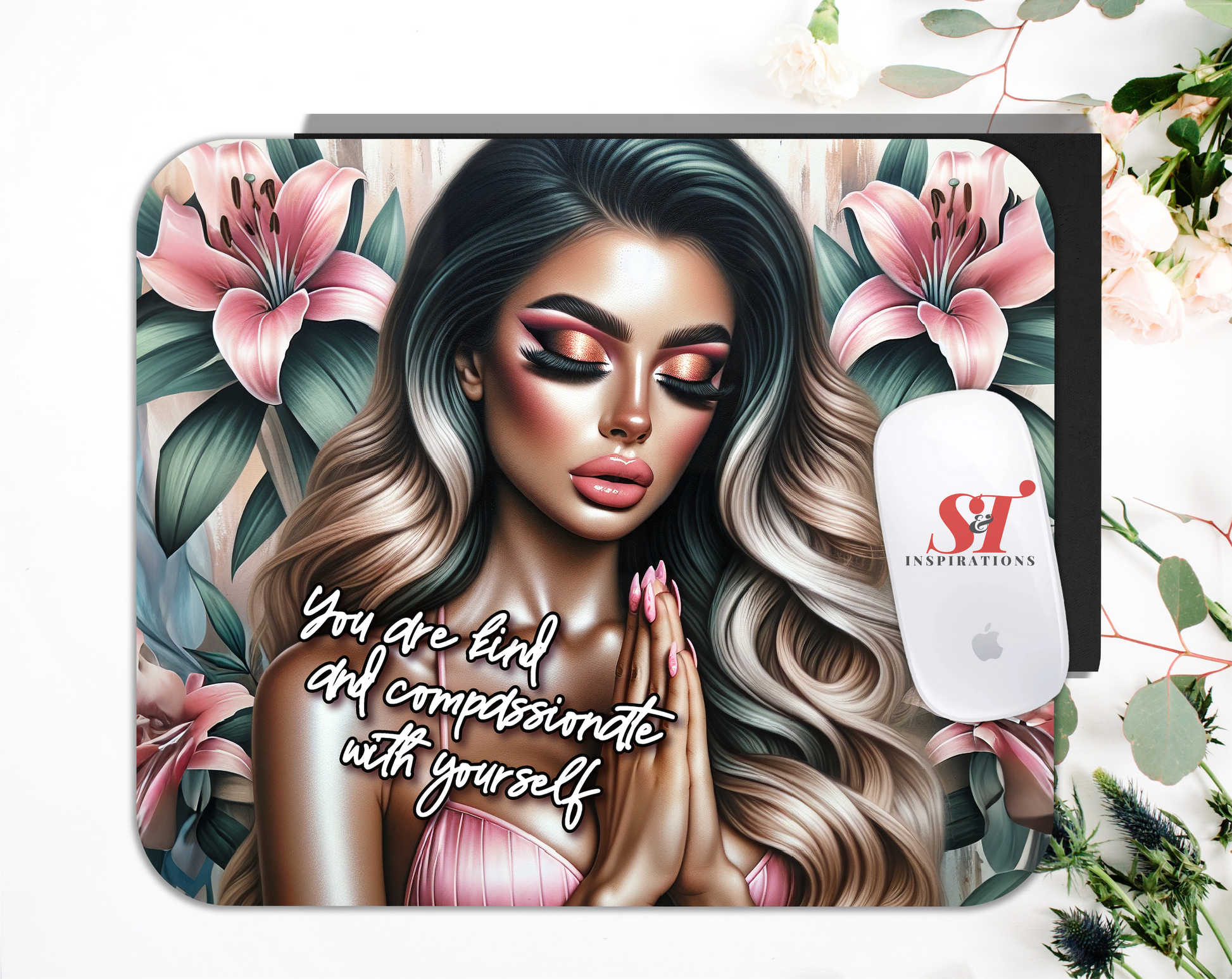Description: This affirmation isn’t just words—it’s a whisper from God to your soul: You are kind and compassionate with yourself. With calming floral visuals and a powerful message, this mouse pad keeps self-love in sight while you work, create, or study.